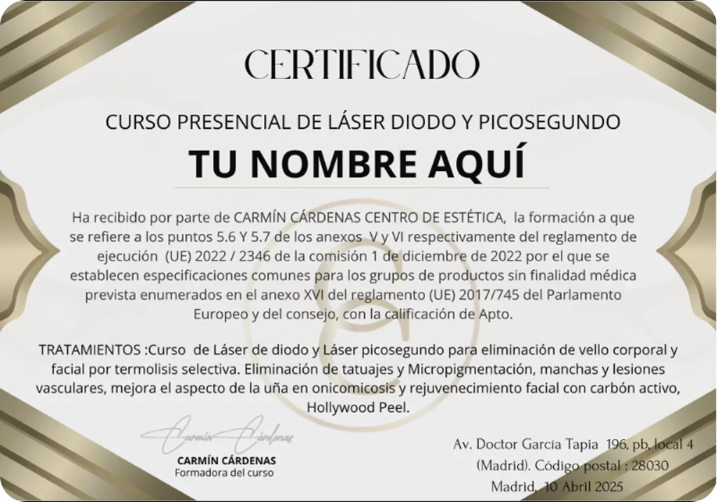 Al finalizar tu capacitación presencial, recibirás este certificado oficial que te acredita como profesional cualificada.