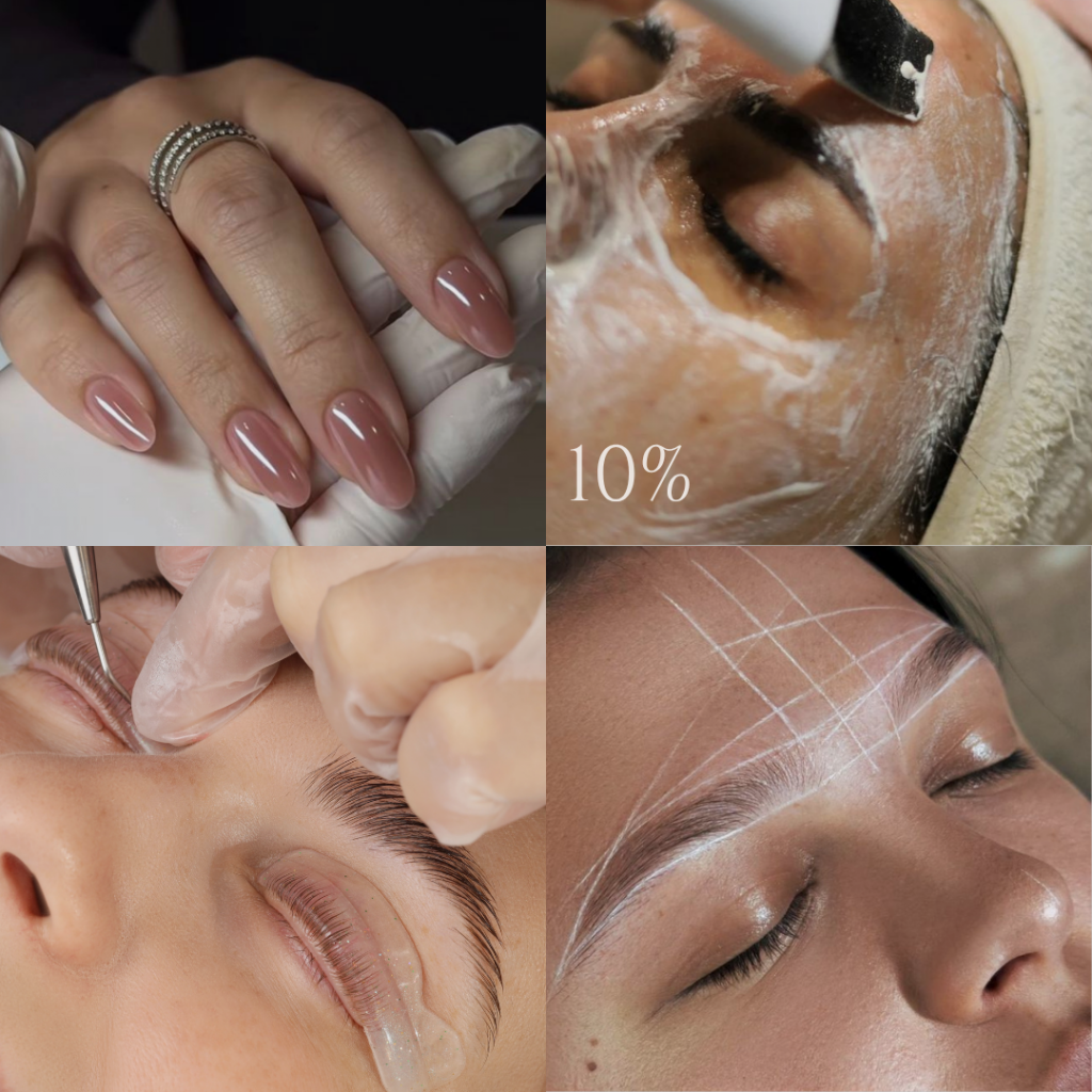 Incluye manicura semipermanente, laminado de cejas o lifting de pestañas, diseño de cejas incluido, regalo de bienvenida, 10% de descuento en tratamientos faciales.